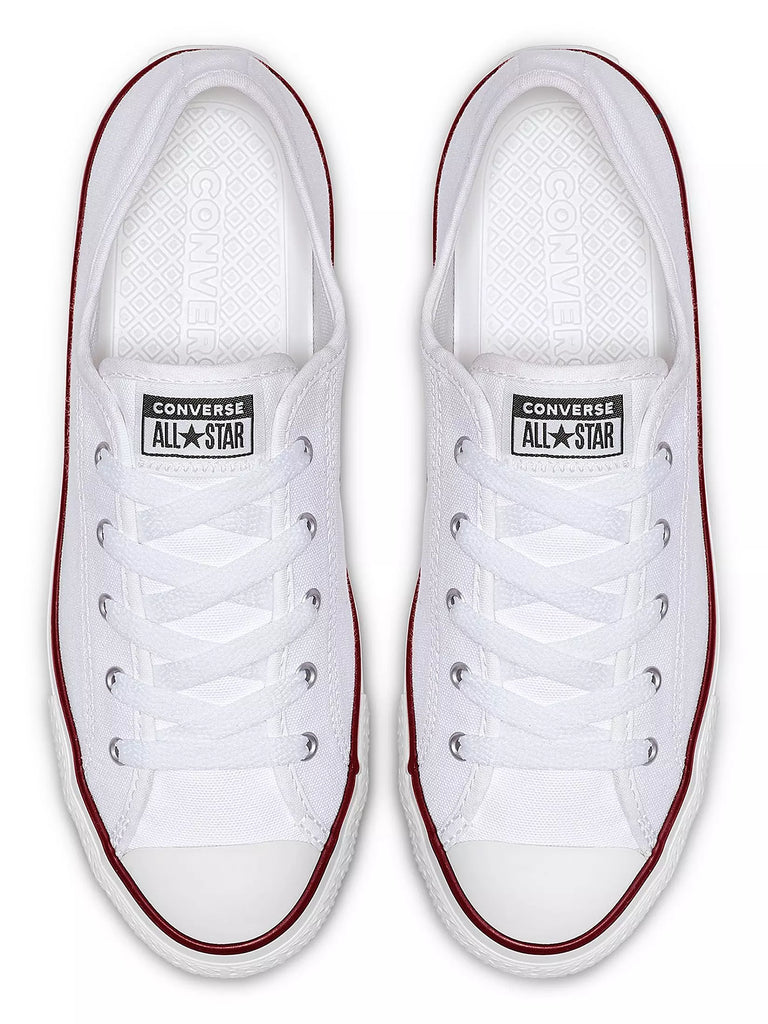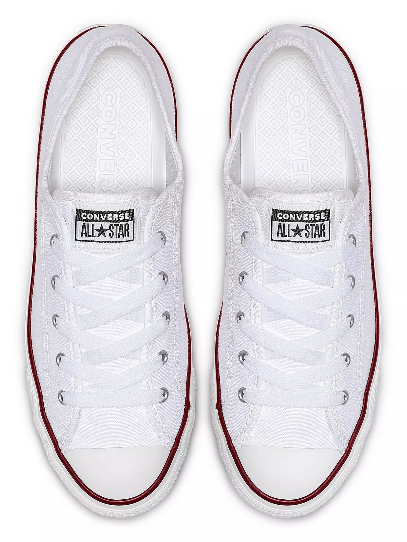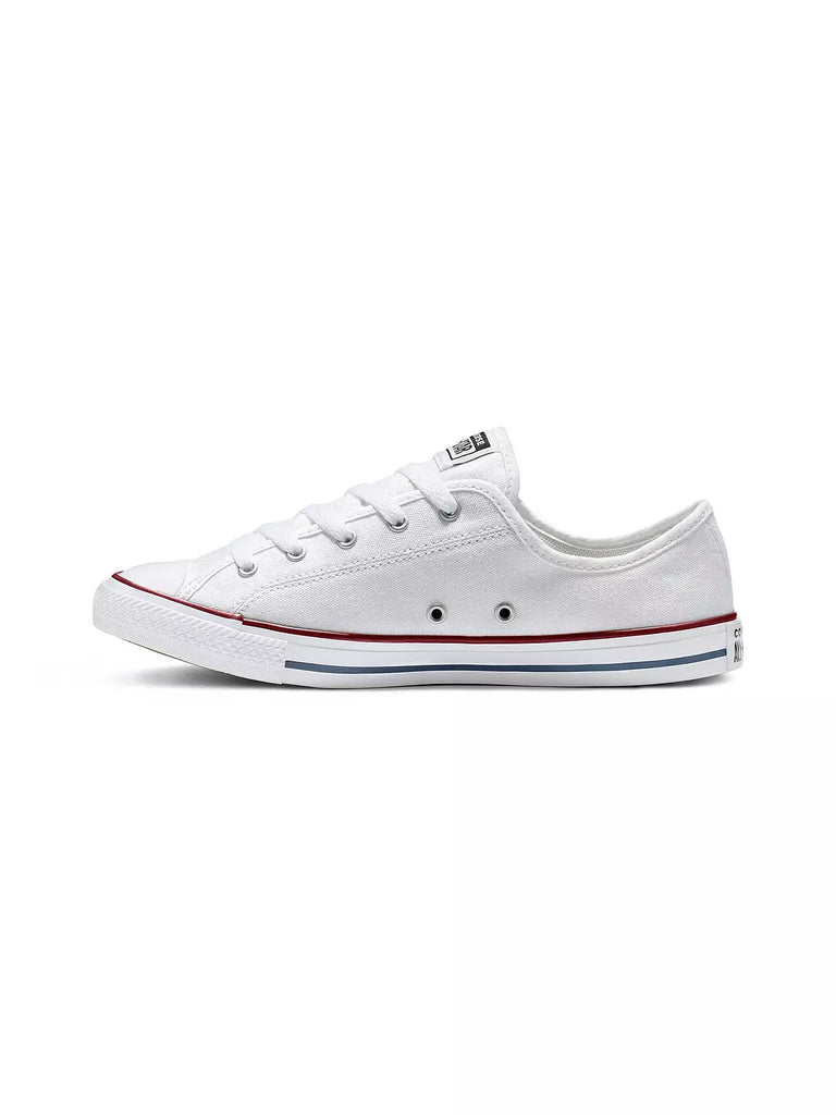 • One of the most famous and recognisable plimsolls on the planet, the Converse All Star is a casual shoe that's perfect for off-duty wear. The Dainty version of the plimsoll features a low cut design, lace fastening and a toffee bottom sole with a white fabric upper. They also have the legendary All Star logo to the tongue and heel for a stamp of quality and as a reminder of the history of this legendary footwear brand.