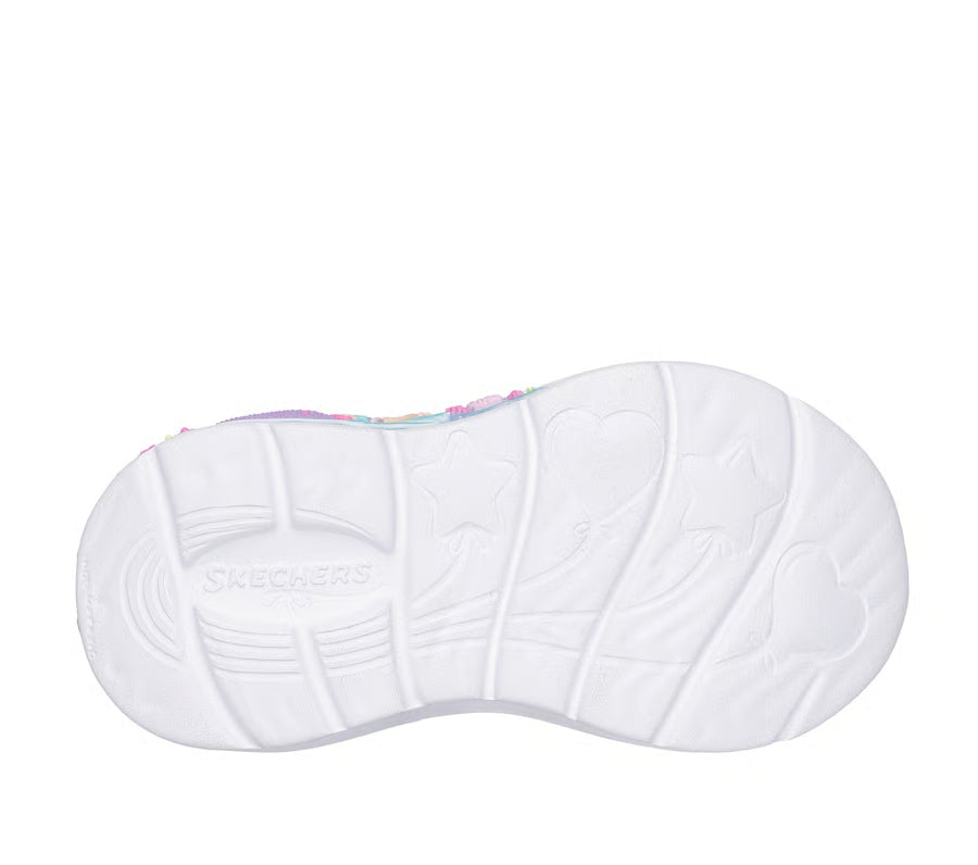 Playful lights and colorful fun combine in Skechers My Dreamers - Lil Mermaid. This light-up sky-themed style features an ombre glitter mesh and synthetic upper with stretch laces, adjustable instep strap and a well-cushioned light-up midsole